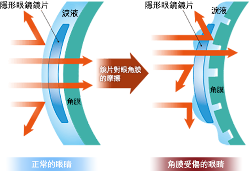 配戴隱形眼鏡時,如果眼睛出現乾澀,鏡片就容易傷害到角膜。而這些存在在角膜上的細小傷口,會使眼球表面的淚液不能均勻分佈。進入眼睛的光線因此會發生散射。導致眼睛看不清,容易出現疲勞。