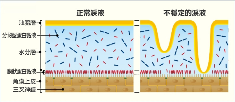 淚液原本應該均勻分佈在眼球表面以保護眼睛遠離干燥。但有眼睛乾澀問題的人,意味著淚液在穩定性上出現了問題。覆蓋在眼球表面的淚液膜有厚有薄,光線進入時會出現散射,令人覺得刺眼看不清。