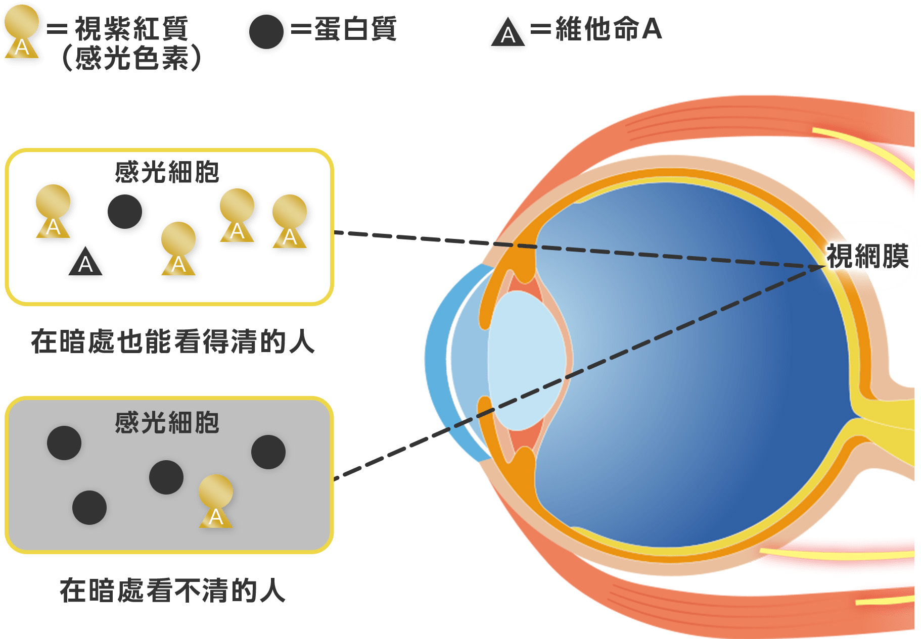 想在黑暗處接收光線,離不開視桿細胞內的感光色素(視紫紅質)的正常工作。而生成視紫紅質的原料之一就是維他命A。當體內維他命A不足時,自然就不能生成足夠的視紫紅質,無法獲取夜間微弱的光線,從而影響了夜間視力。