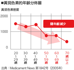 位於視網膜中心的“黃斑部”具備感知色彩的功能。色彩感知功能需要依靠葉黃素、蝦青素中的黃色素來維繫。而這些色素會隨著年齡增長而減少。體內黃色素的減少會影響眼睛的色彩感知能力,導致看東西模糊不清。