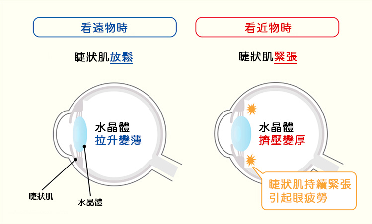 眼睛在看東西時,需要靠睫狀肌拉動眼球中的水晶體來對焦。當看近物時,睫狀肌收縮,擠壓水晶體便可完成對焦。然而隨著年齡增長,水晶體會逐漸變硬失去彈性,即便睫狀肌擠壓水晶體,也很難在看近物時對上焦了。看近物變得吃力,就是老花眼的初期症狀。