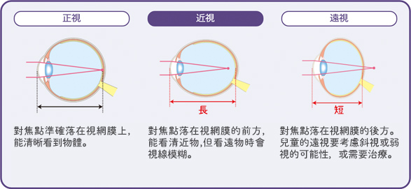 近視的大部分情況,都是因為眼球視軸的長度(也即眼軸長)過長,導致對焦點無法落在眼底的視網膜上。