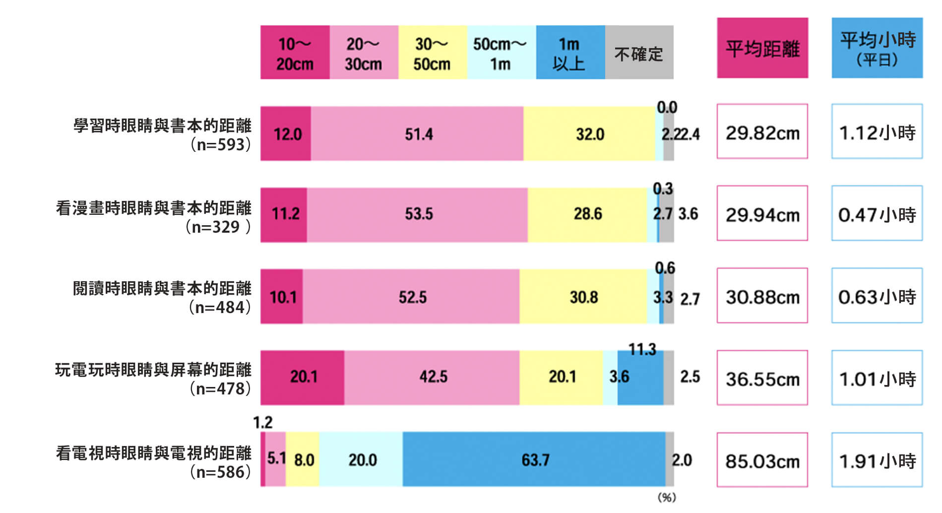調查中還同時詢問了用眼時,眼睛與對象物之間的距離遠近。可以發現,大部分小學生在學習、閱讀、玩電玩時,眼睛與對象物的距離僅為30cm左右。眼睛長時間盯著近物,會導致睫狀肌緊張、造成眼睛疲勞。而這種眼疲勞有可能會引發“假性近視”。