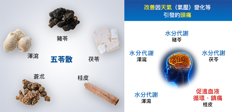中藥裡的五苓散,是由5種漢方生藥構成的方劑。其中4種成分能夠消除水腫,1種成分能夠促進血液循環、鎮定疼痛。綜合來說,這個方劑能夠改善體內的水分代謝,緩解水腫對腦神經的壓迫,被認為可以從根源上緩解天氣頭痛。因此我們就開始了對這個處方的研究和商品化的進程,希望給備受天氣頭痛困擾的人們多提供一個解決方案。