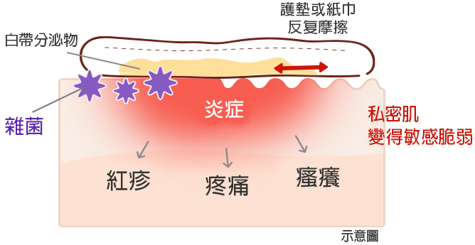 再加上不少女性會使用護墊,或是在上完廁所後用力擦拭,這些摩擦也會損傷皮膚,令私密部