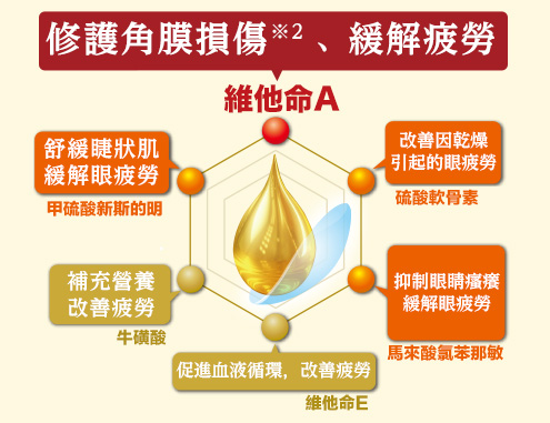 維他命A能夠幫助修復因鏡片輕微摩擦引起的角膜損傷,改善眼疲勞。甲硫酸新斯的明能舒緩睫狀肌,硫酸軟骨素可改善因眼睛乾澀帶來的疲勞感。馬來酸氯苯那敏緩解因光線等引發的輕度炎症所帶來的眼睛瘙癢不適。營養成分牛磺酸促進眼睛細胞新陳代謝;維他命E則促進血液循環、緩解眼疲勞。