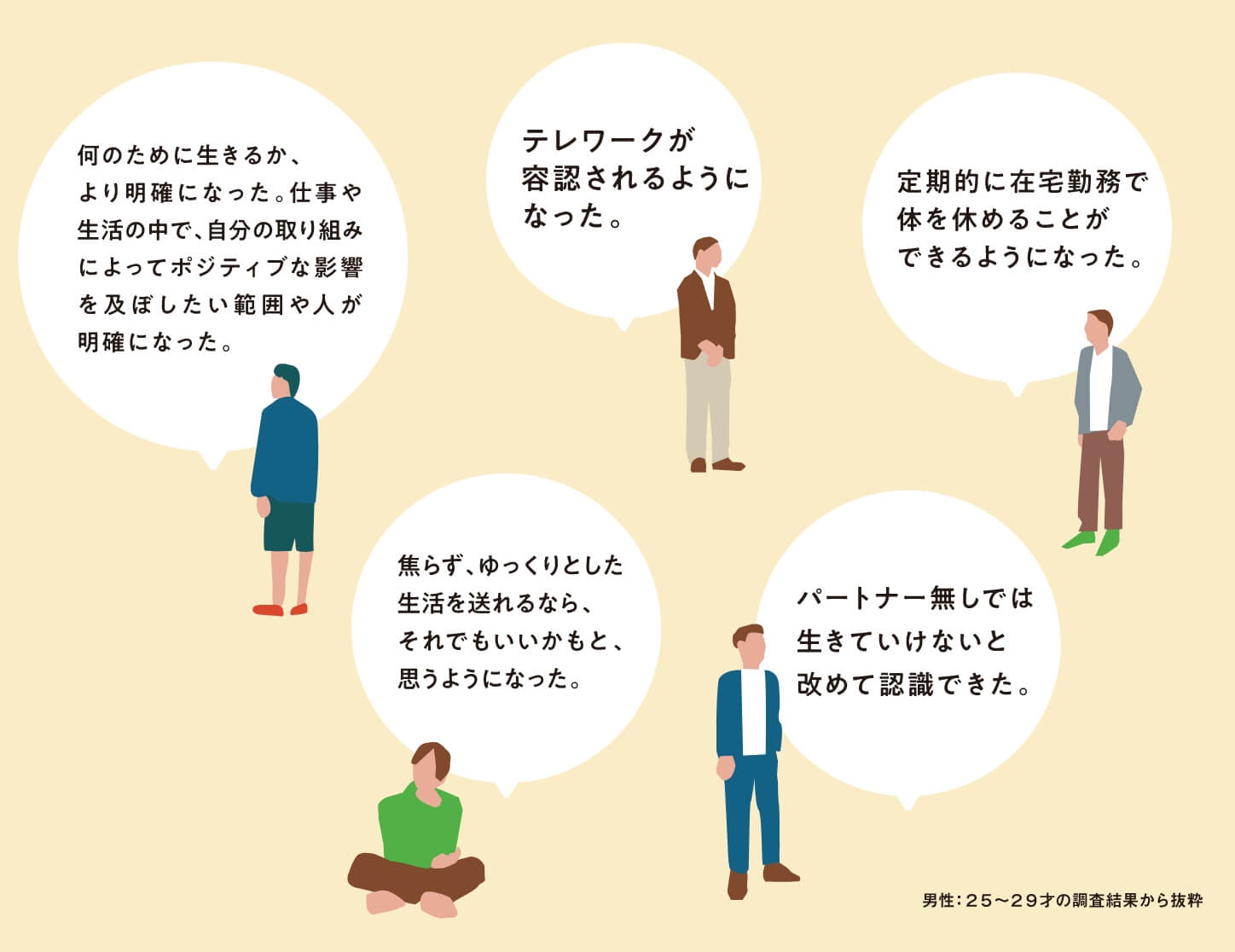 自分自身の健康に加えて、パートナーの健康にもより意識を向けるようになっており、また、特に男性はパートナーの気持ちを気遣うように変化しています。