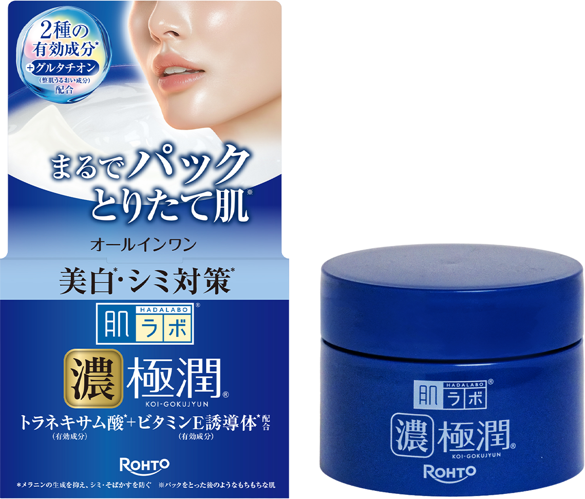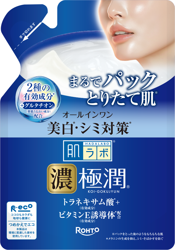 肌ラボ®濃極潤®美白・シミ対策オールインワン まるでパックとりたて※1! 白もち肌。※1:Rロート薬用ブライトゲルAa 医薬部外品 トラネキサム酸(有効成分)+ビタミンE誘導体※2(有効成分)+グルタチオン(整肌うるおい成分) イメージ:メラニンの生成をおさえ、シミ・そばかすを防ぐ ※1 パックをとった後のようなもちもち感 ※2 酢酸DL-α-トコフェロール