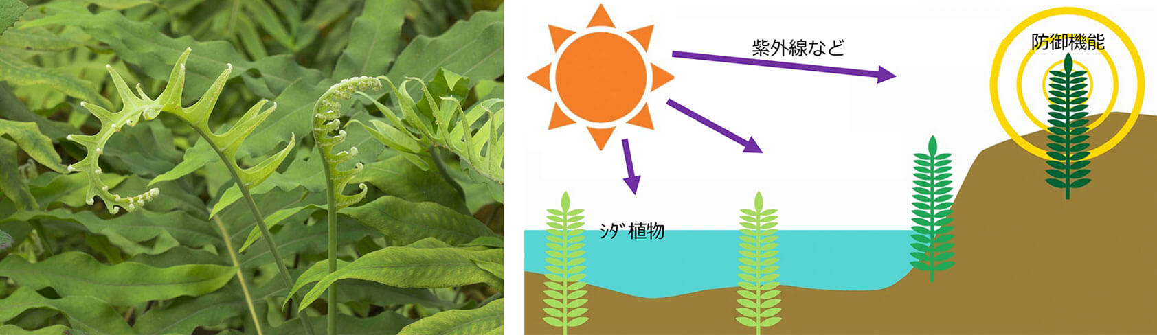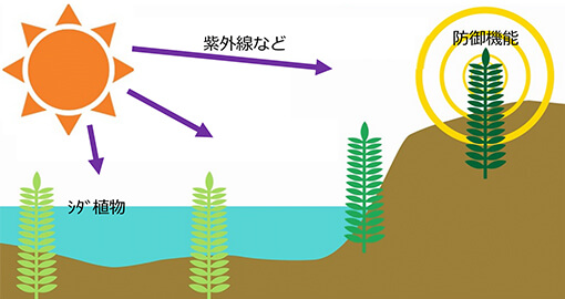 陸上で暮らすためには、降り注ぐ紫外線から身を守らねばなりません。そこで自ら紫外線に対する防御の仕組みを生み出し獲得していったのです。