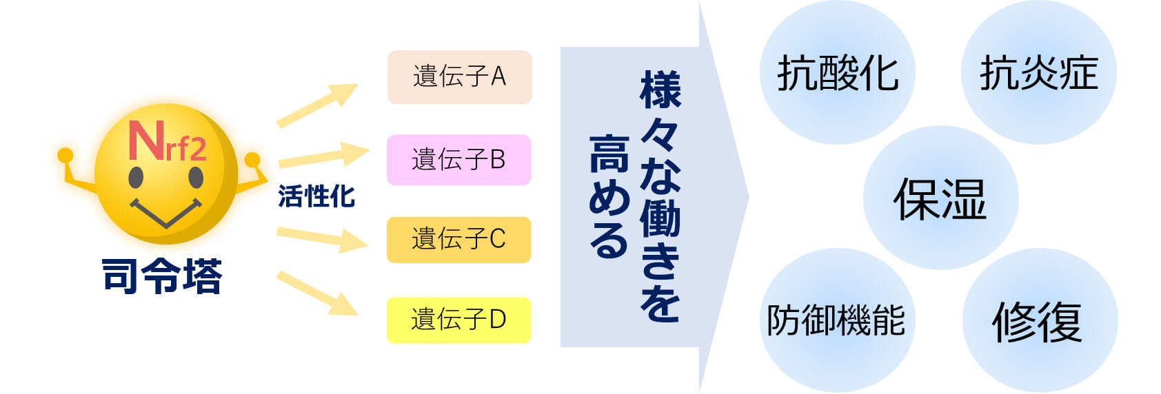 Nrf2はタンパク質の一種で、紫外線ダメージを感知すると抗酸化、抗炎症、保湿、修復などに関わる数百以上の遺伝子を活性化します。