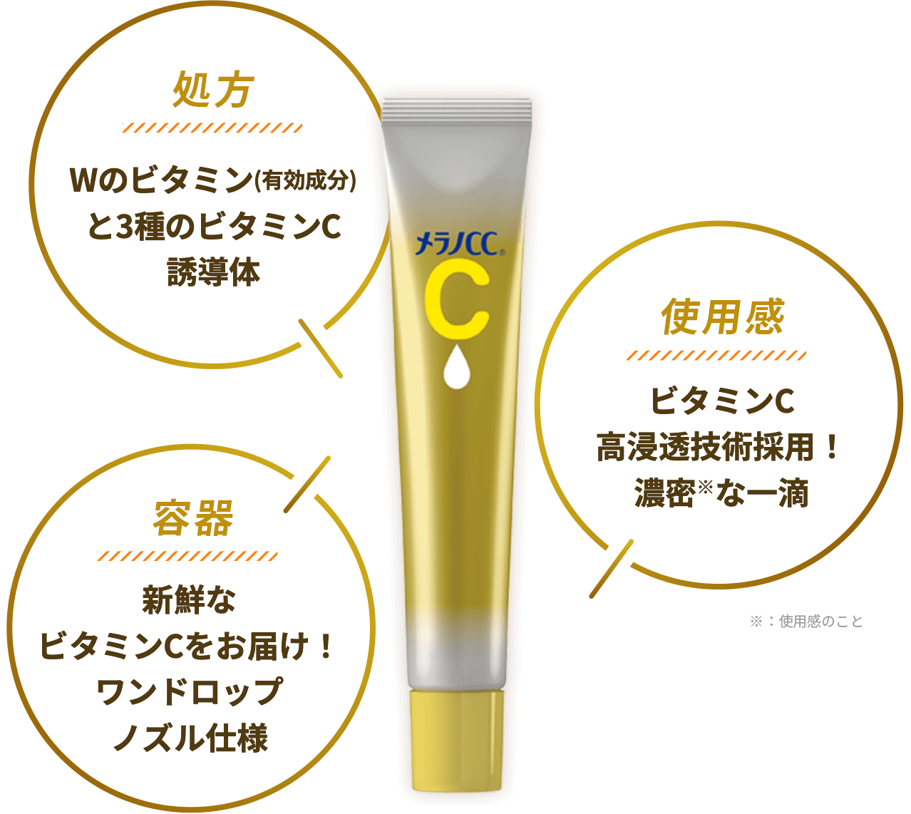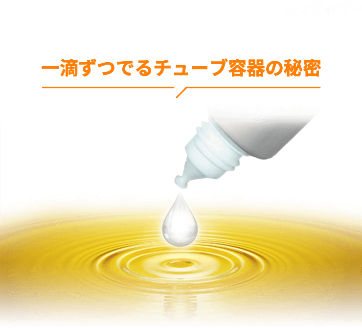 メラノCC美容液で配合している「ピュアビタミンC」は空気に触れると酸化してしまうため、空気が入りにくいチューブ容器を採用しています。実はこの容器、ボールペンの様な構造になっており、出口にある小さいボールが隙間を少なくすることで新鮮なビタミンCをお客様に届けることが出来ます。是非新鮮なビタミンCを一滴ずつ、たっぷりとご使用ください。