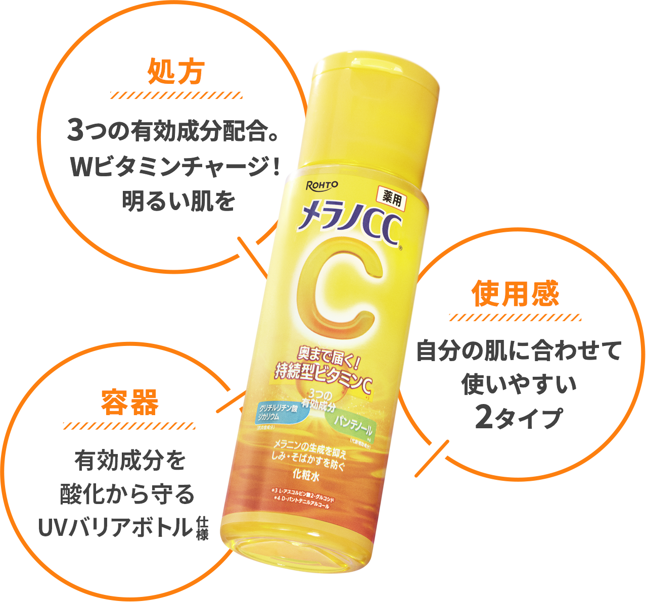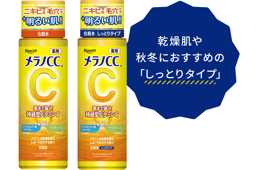 いつものステップに「メラノCCシリーズ」をプラスするだけで、気になる部分を集中ケア。 使用タイミング: