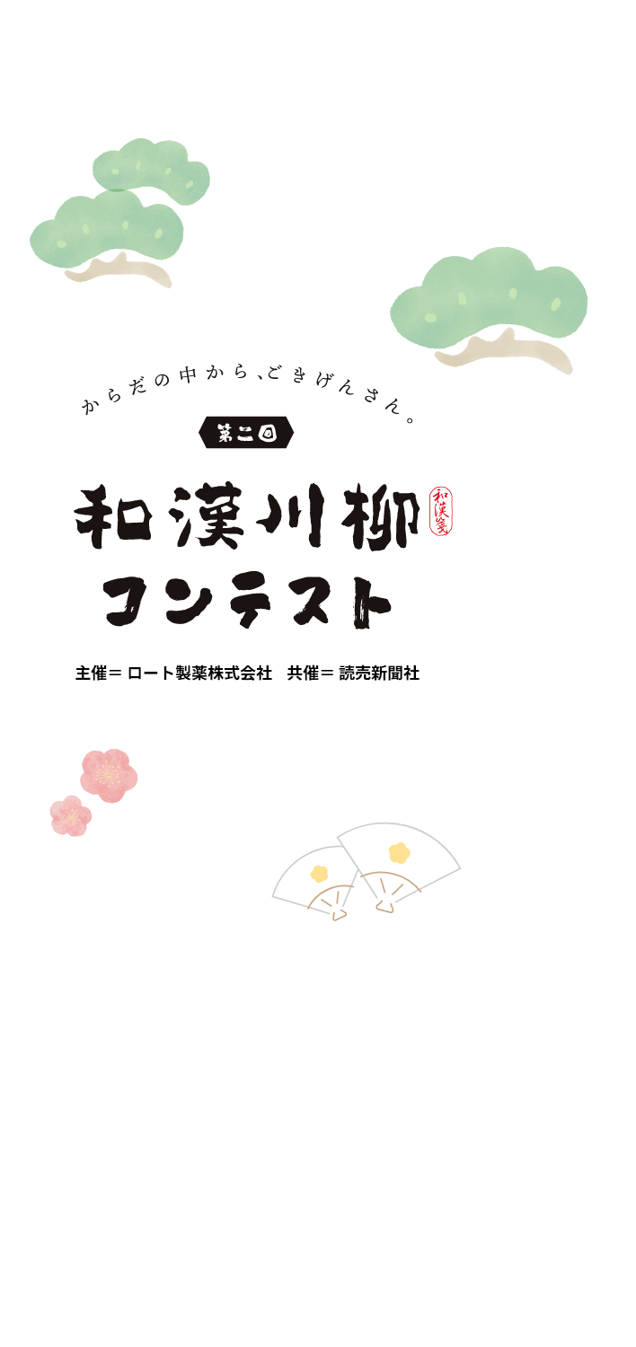 楽しく不調を乗り越える 作品から元気をもらいました 「和漢川柳コンテスト」にご応募いただき、誠にありがとうございました。からだの変化と向き合いながらも、毎日を楽しく過ごしてほしいという思いで始めた本企画は、お陰様で第二回を迎えました。作品からは、不調を楽しい工夫で乗り越える姿や、ご家族とのユーモアあふれるやりとりが目に浮かび、私たちも元気をいただきました。和漢川柳や、ロート製薬の漢方「和漢箋」が、みなさんの健やかな日々に寄り添えていれば幸いです。